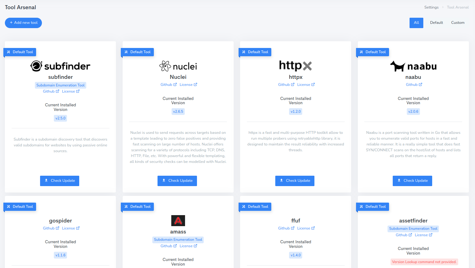 reNgine supports adding external subdomain discovery tools. Tools can be fetched from either Github or Go.