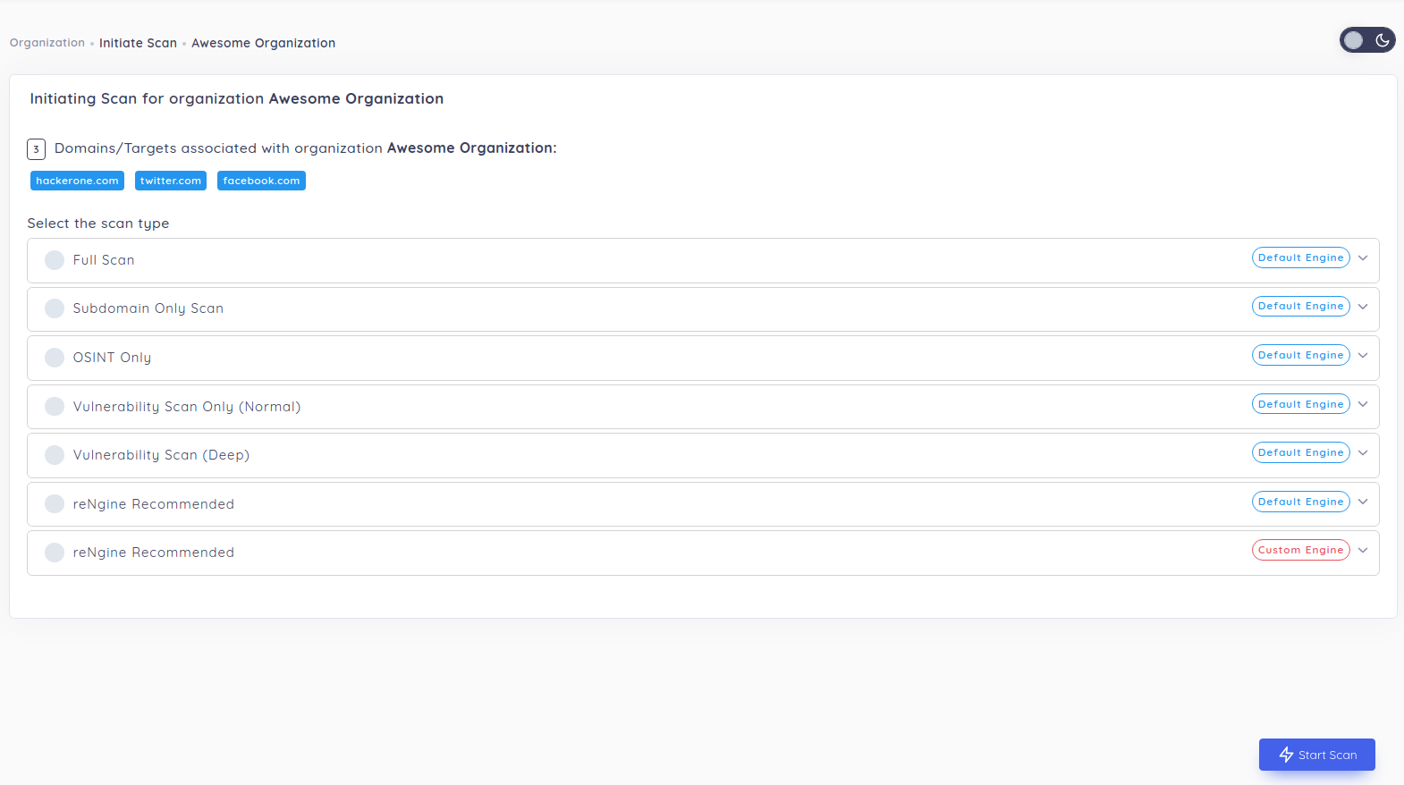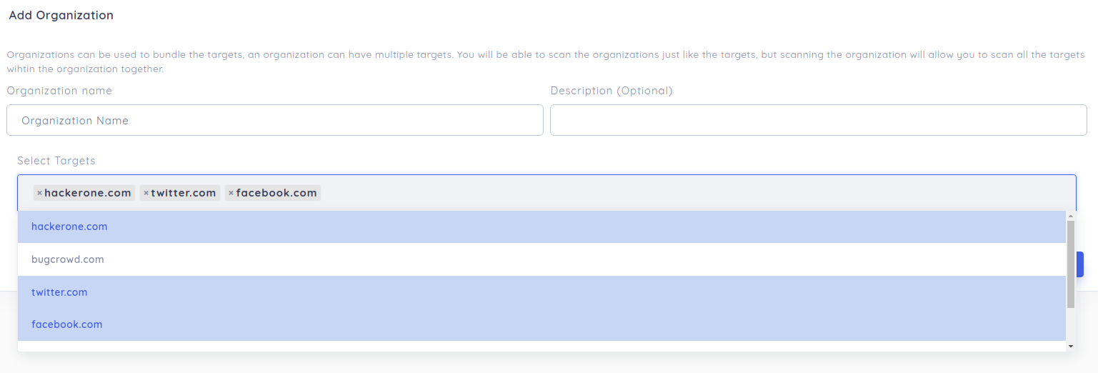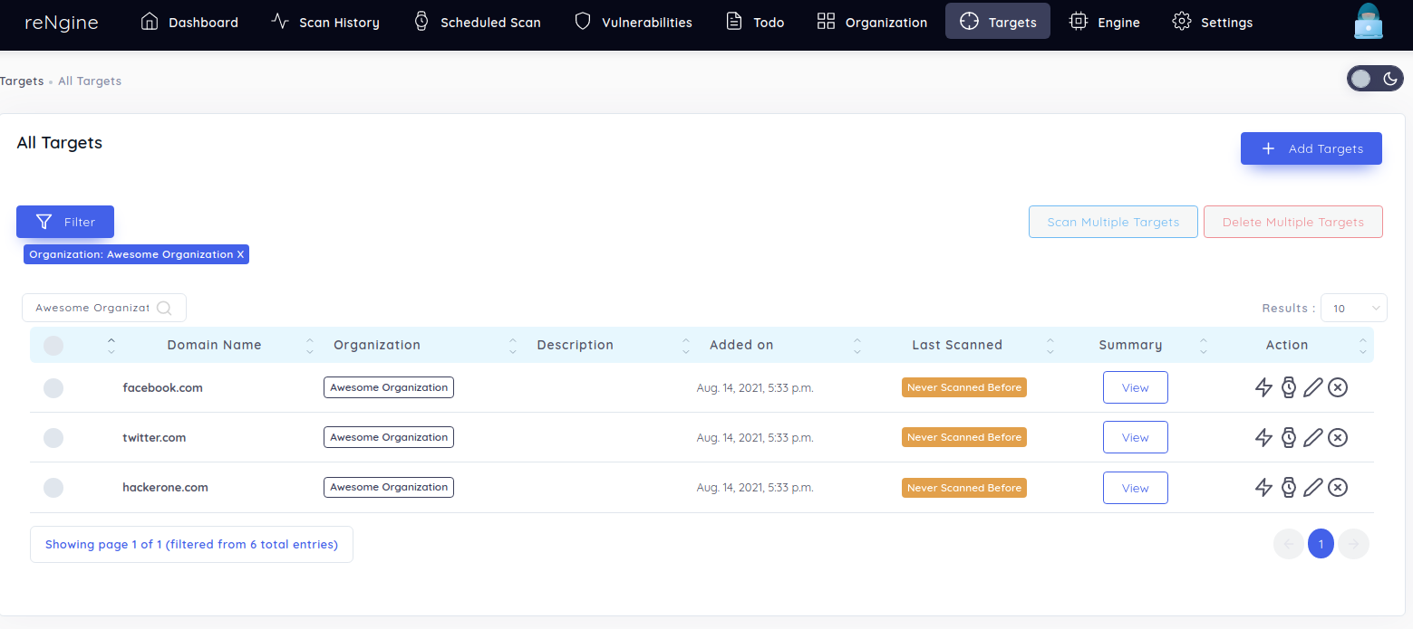 reNgine supports tagging multiple targets to an organization. This allows you to initiate the scan for all targets at once, filter the scan results etc.