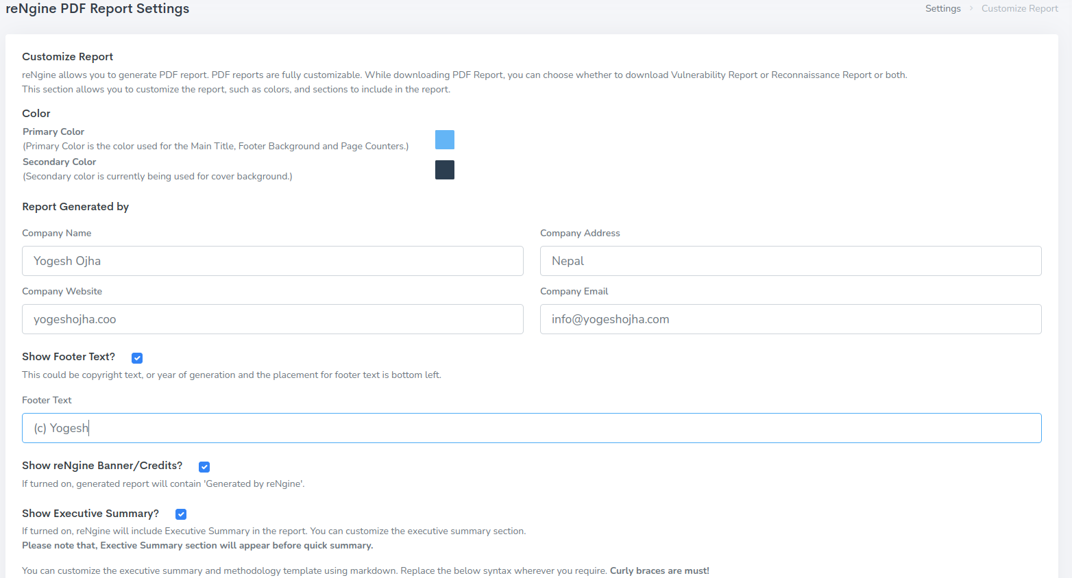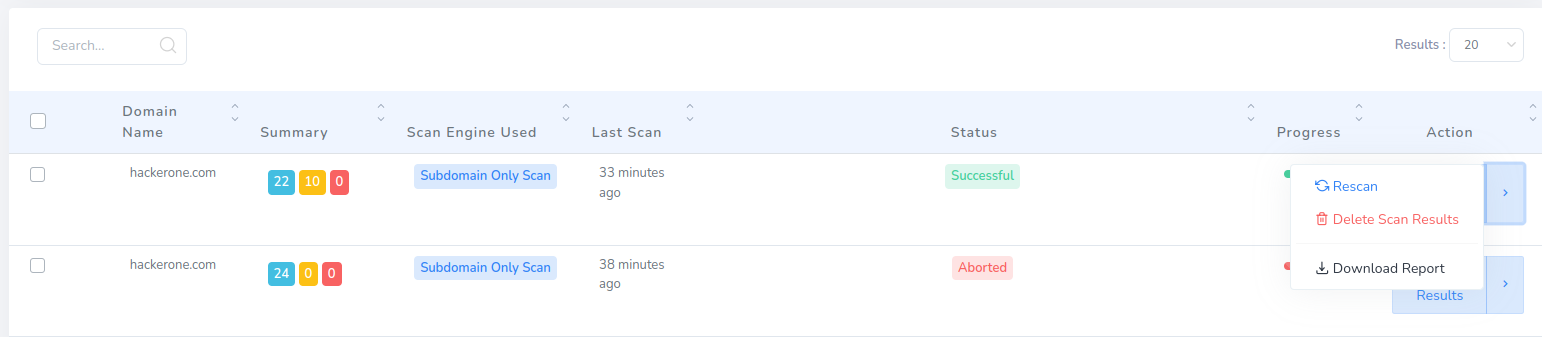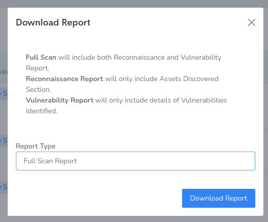 reNgine supports downloading PDF reports. You can either download Full Scan Report or Reconnaissance Report or Vulnerability Report.