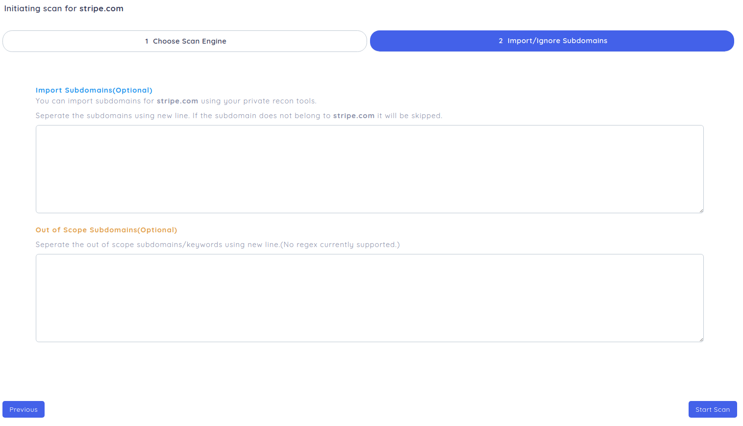 If you wish to skip any subdomains, you can insert those subdomains here . reNgine will not perform any scans on those subdomains.