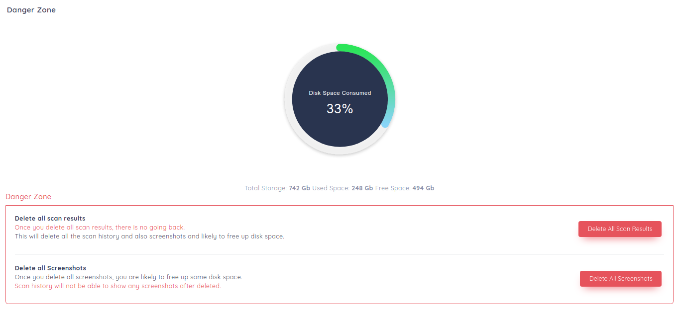 reNgine allows you to cleanup your scan results or just delete all the screenshots. This is because, most of us run reNgine on VPS and are limited by storage space.